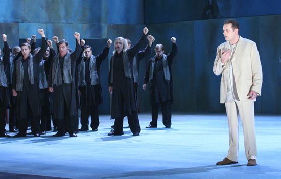 Театральный минимализм нам давно знаком — сцена представляет собой грязно-голубого цвета огромный кабинет, с дверями, красными стульями по периметру и ржавым рельсом, поставленным вертикально по центру (рельс или что-то в этом роде, видимо, элемент деконструкции мира). Действующие лица — наши современники, как водится, в темных длинных пальто с шарфами (хор) или костюмах-тройках (солисты). Картинка в целом абсолютно среднестатистическая. Но это ничего, лишь бы из подобного повторения давно опробованных приемов возникал смысл. Не возникает.