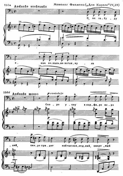 Тем не менее «Дон Карлос» — замечательное произведение, характерное для дальнейших творческих исканий Верди на путях создания сквозной музыкальной драматургии, принципы которой намечались в «Риголетто» и «Травиате», особенно же в «Симоне Бокканегре». Богатство и острота психологических характеристик, выдающимся примером которых являются монолог Филиппа II (см. примеры 150 а, б) и следующая за тем сцена с Великим инквизитором или дуэт Родриго и Филиппа, а также ария Елизаветы из последнего акта или ария Эболи, сочетаются с широко выписанным социальным фоном действия.