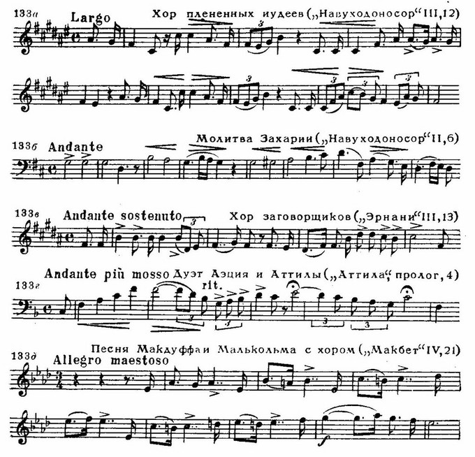 Ниже приводятся наиболее известные примеры таких мелодий Верди: а) хор плененных иудеев из оперы «Набукко» (Популярность этой мелодии в Италии была длительной и устойчивой: так, например, на похоронах Верди ее внезапно запела тысячная толпа провожающих.); б) молитва Захарии из той же оперы; в) хор из сцены заговора в III акте «Эрнани», где вместо прославления Иберии (древнее наименование Испании) пели славу Италии; г) фраза Аэция из дуэта с Аттилой в одноименной опере «Пусть тебе будет принадлежать вселенная — Италия останется мне» — эта фраза сопровождалась возгласами зрителей: «Италия — нам»; д) песня Макдуффа и Малькольма с хором «Родину предали» из «Макбета»: