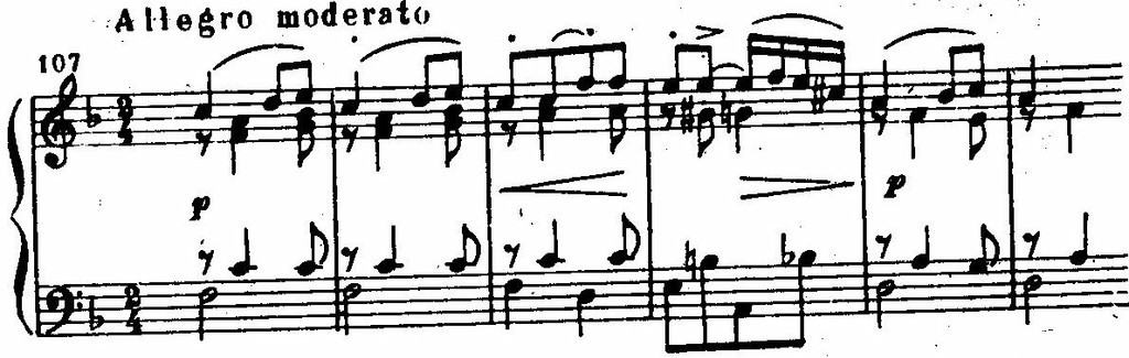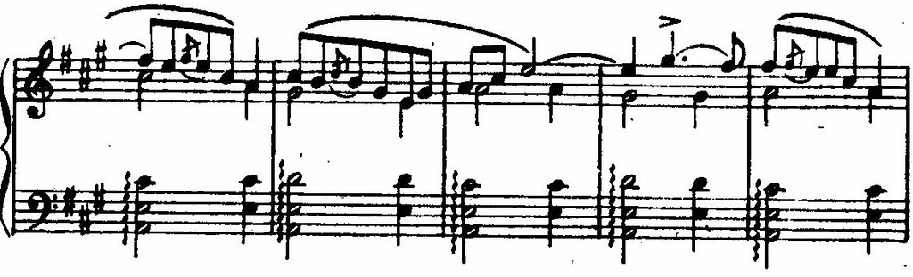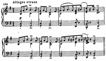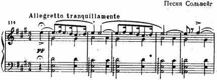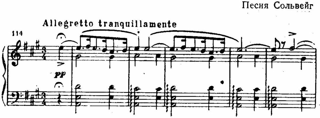 Мелодии Грига пронизаны интонациями, типичными для норвежской музыки, такими, например, как ход от первой ступени лада через вводный тон к квинте: