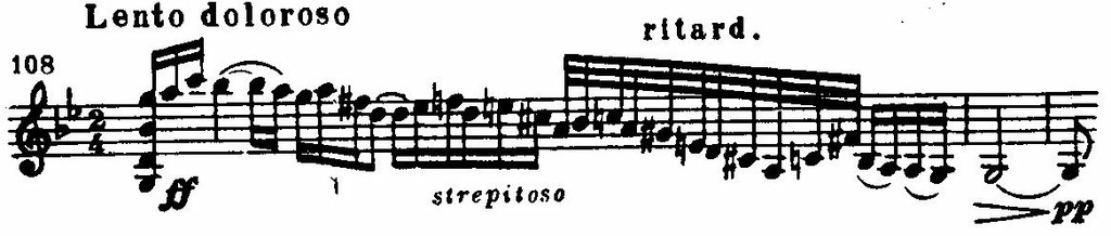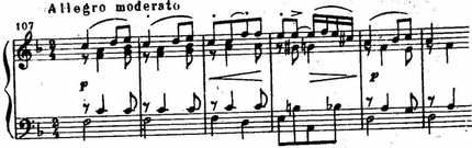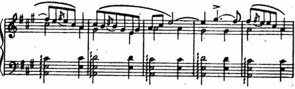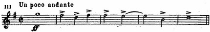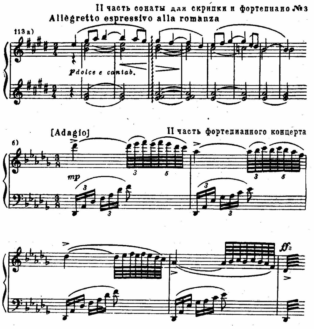 Типы мелодического движения зачастую напоминают характерные народные инструментальные наигрыши. Так, прообразом вступления ко второй скрипичной сонате являются импровизации народных скрипачей (см. пример 109). Такие фактурные приемы, как выдержанный органный пункт в басу, квинтовый бас, идут от звучаний народной инструментальной музыки.