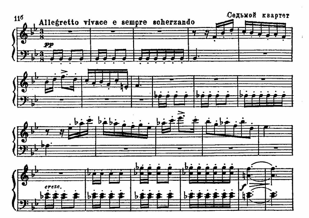 Вместе со следующей частью – Allegro molto vivace – она образует весьма характерное единство и противопоставление созерцательных и жанрово-действенных образов; третья – исключительно краткая часть – не более чем переход к огромным вариациям Andante; пятая – расширенное Scherzo; шестая, Adagio, – лирическое контрастное вступление к драматической кульминации, финалу; он написан в динамической сонатной форме и построен на тематическом материале, полярно контрастном по отношению к теме фуги – предельно доступном, пронизанном песенными интонациями, отмеченном изумительной, непосредственной красотой: