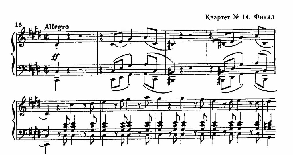 По существу же весь квартет образует грандиозное произведение с единым сквозным развитием, где ни одна часть не завершается, а непосредственно сливается с началом следующей. Идею этого произведения можно охарактеризовать как непрерывные психологические колебания между размышлением и действием, которые, наконец, разрешаются активным жизнеутверждением.
