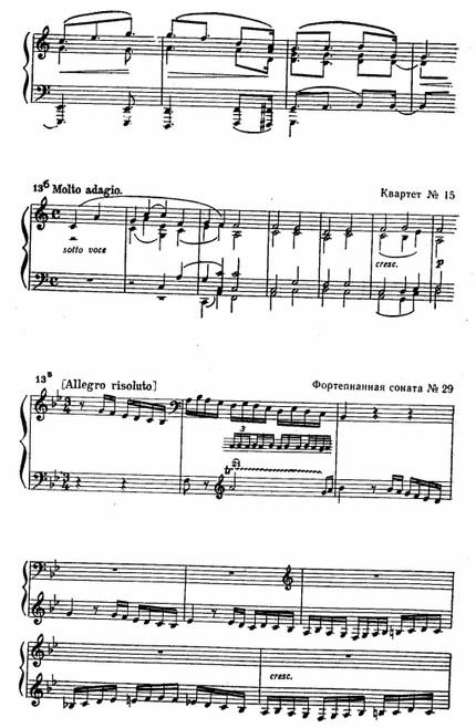 Происходят изменения и в области формы. Монументальность и грандиозность замысла, превосходящая все дотоле созданное композитором, сочетается с тончайшей детализацией отдельных страниц. Разрослись и части цикла и весь цикл в целом. Так, масштабы вариаций из последней сонаты, фуги из сонаты ор. 106 не имеют себе равных в фортепианной литературе. В квартете ор. 131 семь частей. Первая – Adagio – фуга, построенная на типичном для позднего Бетховена интонационном материале: