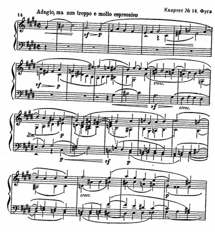 В связи с усилением рационального, философского начала в музыке Бетховена чрезвычайно разрастается значение полифонии. Помимо отдельных полифонизированных приемов, композитор впервые так широко использует законченные полифонические формы. Двойная фуга в финале Девятой симфонии, фуги в финалах фортепианных сонат ор. 106 и ор. 110, ряд фуг в «Торжественной мессе», первой части квартета ор. 131, в вариациях на вальс Диабелли, большая фуга для квартета ор.133, фуга для квинтета ор. 138 – все это высокие образцы бетховенского полифонического искусства позднего стиля. Преимущественно в фугированных произведениях и появляются новые, более абстрактные интонации, лишенные яркой образности и чувственной прелести эмоциональных бетховенских тем раннего и среднего периодов.