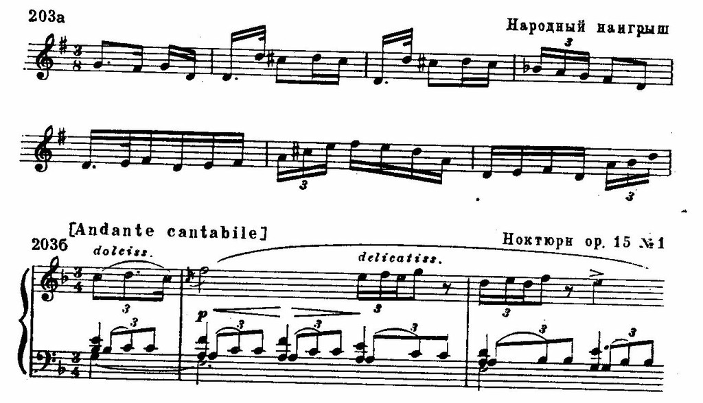 С другой стороны, воздушный образ Fis-dur'ной прелюдии достигается только при помощи педального фона и особого сочетания пианистических регистров. Сама тема предельно проста, гармонически почти примитивна (пример 198 в).