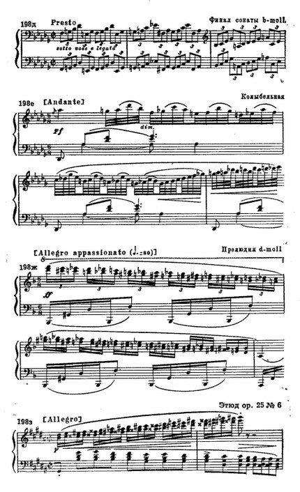 «Потусторонность», жуткость настроения, пронизывающего фи-нал b-moll’ной сонаты, в большой мере обязаны своей выразительностью своеобразной фактуре — «бестелесному» пустому унисону, образующему сложную фигурацию (пример 198 д)