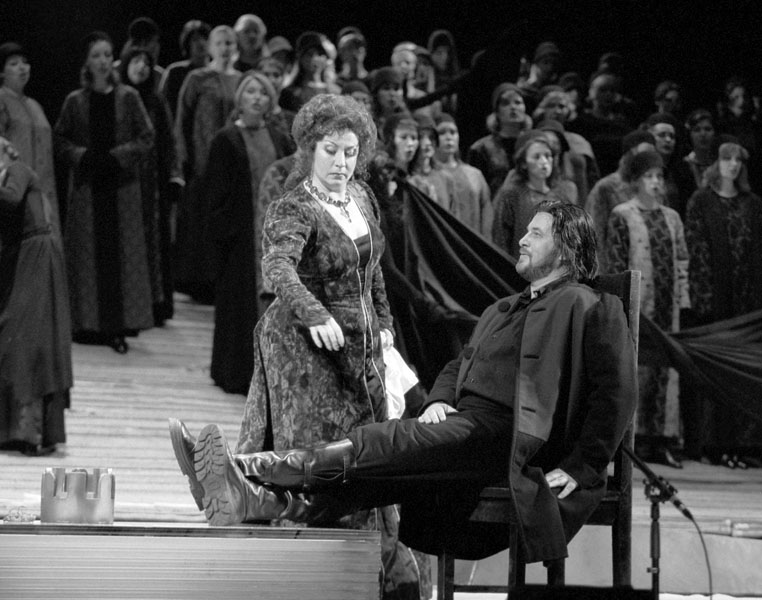 Хуже обстоит дело с главной героиней. Елена Зеленская — опытный мастер, и вроде бы все делает как надо, и с труднейшей партией, исключая отдельные виртуозные пассажи, в целом справляется. Но ни голос певицы, ни ее вокальный и актерский темперамент не дают ей по-настоящему соответствовать образу: ни трагического величия, ни «дьявольского» в голосе, как того хотел Верди, ни мощной воли и энергии, о которых говорит Някрошюс, в ее Леди нет, как нет настоящего драматического нерва у самой певицы.
