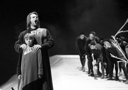 Безусловно, удалось создать атмосферу трагедии. Только в отличие от Шекспира и тем более Верди у Някрошюса это — эпическая трагедия, как было и в его предыдущем, неоперном «Макбете», которого несколько лет назад привозили на «Золотую Маску». Как и тогда, спектакль создавался «семейным подрядом»: сценографию делал сын режиссера Мариус, костюмы — жена, Надежда Гультяева. Тем не менее общего между этими спектаклями не так уж много. Меньше даже, чем между самой трагедией Шекспира и оперой Верди.