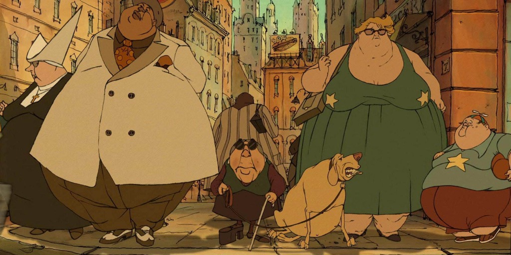 Серьезные люди в черном, словно вышедшие из спектаклей Коршуноваса (сплошные плечи, а головы не разглядеть, эдакие геометрические фигуры), похищают выросшего Чемпиона. Происходит это во время гонок, где подросший внук имеет довольно жалкий вид, и победа ему не светит. Тем не менее незнакомцы увозят любимое бабушкино чадо, надежду ее жизни в таинственный мегаполис Бельвилль, напоминающий Нью-Йорк, Париж и Монреаль вместе взятые: небоскребы и ни с чем не сравнимые срезанные углы улиц, свойственные французской столице. Есть тут смешная, почти карикатурная статуя Свободы и много-много толстых людей. Это, если угодно, некие стереотипы восприятия американского континента в Европе. Теперь Чемпион крутит педали в каком-то клубе Бельвилля, развлекая богатую публику и создавая иллюзию участия в настоящих гонках.