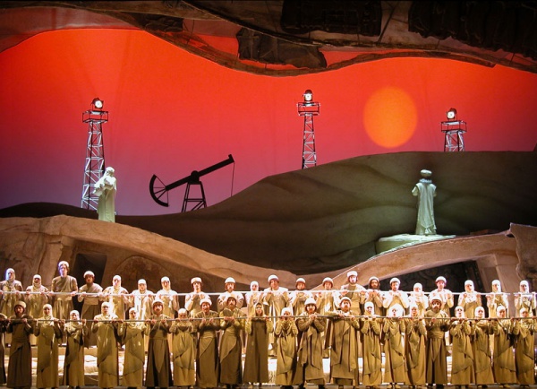 Новая постановка «Геликона» не из тех, в которых сюжет романтической оперы радикально осовременивается, но здесь найдены точки, где кровавая ветхозаветная история соприкасается с современностью. Место вавилонских идолов заняли нефтяные вышки, место трона — золотая ванна, поскольку стремление к величию в наше время благополучно заменила страсть к комфорту. Барельефы приводят на ум разграбление ассирийских древностей при оккупации Багдада, а пещера, куда заточен потерявший разум Набукко, — бункер Саддама. Сцена с захватом Фенены в заложницы не придумана, она изначально имеется в опере Верди. В общем, есть над чем поразмыслить, но все эти «поводы к размышлению» об истории в современности поданы ненавязчиво, потому что, как почти всегда в спектаклях Бертмана, главное — то, что происходит с людьми, с их душами, а это тема вечная.
