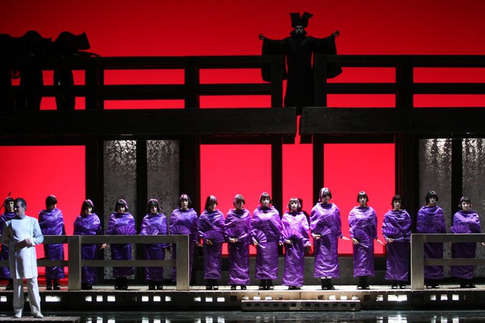 Сцена пуста, иногда на нее выкатывается легкая двухэтажная, разнообразно обыгрываемая конструкция. Свет и цвет, каждый раз чистые, без смешения, без полутонов и теней, необычайно важны (художник по свету Станислав Земба). Сопоставления красок, к примеру, лиловых девичьих нарядов (художники по костюмам Магдалена Теславская и Павел Грабарчик) и алого пространства — так неожиданны и обнаруживают такой изысканный вкус! А как красивы лодки, плывущие на фоне красного неба по черной воде — символ встреч и разлук! Или обрушивающийся с небес ковчег в виде огромной кабаньей головы, где восседает Бонза. Или в финале светящийся замкнутый круг, поддерживаемый двумя устрашающими белыми божествами — символ безысходности. Или свадебный, красного шелка пояс, который приносит ступающая на пальцах печальная старуха, мать Баттерфляй — развертываясь, он напоминает поток струящейся крови.