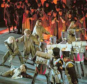 Интересно, нетрадиционно решен пожар Москвы - вместо привычных бутафорских алых тряпок, дыма и световой ряби все зеркало сцены закрывает гигантский красный планшет: он же - и кремлевская стена, он же - и символ гибели старого, патриархального мира дворянско-купеческой столицы.