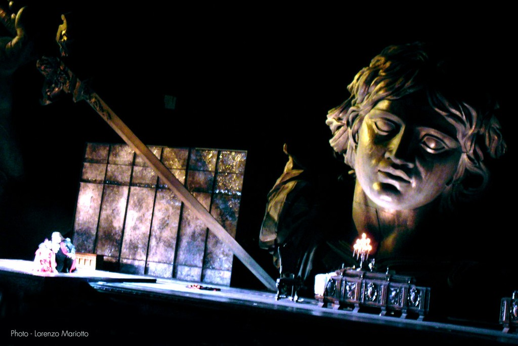 В том, как Де Ана организует пространство, всегда есть нечто поразительное и в то же время узнаваемое. В том знаменитом «Набукко» была наклонная панель: видоизмененная, она присутствует и в «Тоске». Панель, подобная ящику Пандоры: в ней непременно откроются «дыры», из которых посыплются «сюрпризы». Огромную сцену Арены в «Тоске» Де Аны доминирует голова Ангела. Того самого, из замка Сант-Анджело, на верхней площадка которого расстреляют несчастного Каварадосси. По бокам — элементы той же самой скульптуры: слева рука с длинным мечом и справа кисть, сжатая в кулак. В третьем действии воинственно поднятая рука плавно спускается на землю с неумолимостью, с которой приближается страшная развязка. О шумящих далеко от величественных красот Вечного Города наполеоновских войнах напоминают пушки.