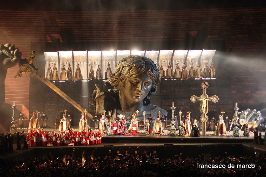 После сравнительно аскетичных «Сельской чести» и «Паяцев» Арену ждет взрыв, что-то грандиозное, из ряда вон выходящее. Можно было бы сказать: невиданное, но это не было бы правдой. Ибо аргентинский сценограф и режиссер Хуго Де Ана уже поразил веронскую публику в недавнем прошлом, представив самого оригинального и незабываемого «Набукко», которого только можно себе предствить. Из-за этого же «Набукко» судился с театром и выиграл процесс: технические трудности постановки оказались не совсем по плечу веронской команде. И вот возвращение. С оперой интимного характера, глубоко отличной от более «аренианского» «Набукко», требующего участия хоровых масс: пуччиниевской «Тоской». Возвращение на щите.