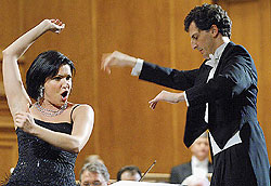На долю партнеров Нетребко достались свои крохи. Бас-баритон д'Арканджело уверенно отпел Лепорелло и Эскамильо, но убегал от дирижера в дон-жуанской “арии с шампанским”. Меццо-сопрано Семенчук в арии Далилы не раскрыла своих несомненных талантов и была попросту плохо слышна в нижнем регистре, с Хабанерой Кармен справилась прекрасно, но переусердствовала с актерством. А ее бис и вовсе стал казусом. Когда раздались звуки угрюмой песни “Жди меня, и я вернусь” (впрочем, это тоже оперный номер — из оперы Кирилла Молчанова “Зори здесь тихие”), часть зала потупила глаза, будто ощутив себя в середине 70-х, и стала завидовать итальянскому дирижеру: он был, несомненно, единственным человеком во всем зале, кто соприкасался с этой музыкой впервые. Но молодая певица, выросшая в новую эпоху, ничего ностальгического, конечно, в виду не имела — просто спела то, чему ее научили старшие.