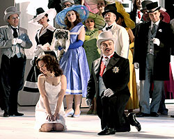 По залу то и дело проносилась струя веселья: живейший отклик находили меланхоличные стенания Принца «Отнеси-и-ите меня-а-а в теплую постель!», и остервенелая перебранка Комиков, Трагиков и Лириков, неожиданно врывающихся в зал справа и слева. В яме бушевал оркестр; Гергиев, с его неподдельной любовью к музыке Прокофьева, дирижировал с бешеным напором, от чего слегка затемнялась ироничная интонация партитуры, зато рельефно выступала магическая ее сила. Тенорок Андрея Илюшникова (Принца) все слабел и слабел, окончательно пропав к концу спектакля. Величавый бас и королевские манеры Геннадия Беззубенкова (Король Треф) были, безусловно, хороши и убедительны, но и его голос порою давал сбои. Отлично спел и сыграл Сергей Семишкур (Труффальдино): подвижный как ртуть, он бегал, прыгал, и прилично пел вдобавок. Анастасия Калагина в партии Нинетты продемонстрировала лучшие качества своего высокого нежного сопрано. Однако в целом визуальная сторона спектакля была выигрышней, органичней и более цельной, чем вокальная.