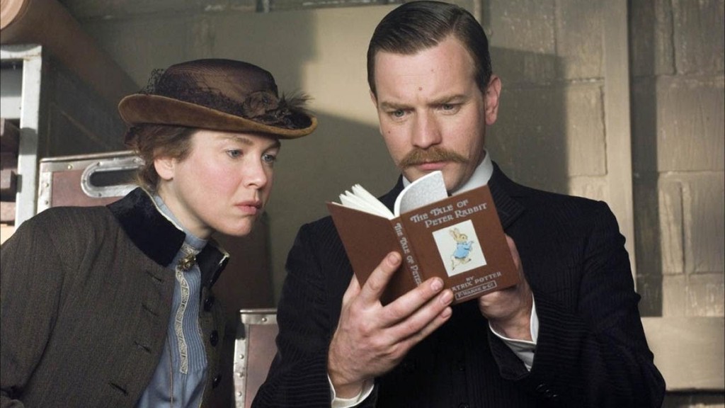 ...Два брата-книгоиздателя Ворн видят перед собой эксцентричную старую деву (Поттер в описываемое время было 36, в фильме же ее «омолодили» на четыре года) с портфолио «кроличьих» рисунков в руках. Дабы отделаться, а попутно занять младшего, неопытного в семейном бизнесе братца Нормана, старшие препоручают тому мисс с ее тематикой «ребятам о зверятах». Мол, ничего путного не выйдет. Однако Норман Ворн (Эван МакГрегор, раньше работавший с Зельвегер в романтической комедии «К черту любовь!») оказался парнем с воображением, разделившим причуды Беатрикс Поттер да еще нашедшим в них коммерческий потенциал. Благодаря ему «Сказки кролика Питера» увидели свет. А две родственные души, два случайно встретившихся одиночества нашли друг друга. Флэшбеки, отсылающие к юным годам героини, убеждают в том, что девочка, рисующая мышат, зайчиков и свинок на скотном дворе, выбрала свой, особый путь, и потому до встречи с Норманом и его сестрой-суфражисткой Милли (в этой роли блистает Эмили Уотсон) друзей не имела. За таковых держала кроликов в курточках с медными пуговицами, которых щедро порождала ее фантазия. Между тем благополучное детство завершилось (только не в голове героини), и состоятельная семья Поттеров, парвеню, как говорила о родителях героиня, подыскивала упрямой дочери подходящую партию. Пусть неразумная и обещала никогда не выходить замуж. Комическое в фильме прерывает джейн-остиновскую линию, когда мы видим, как повсюду за главной героиней ходит специально приставленная пожилая компаньонка — нравственность блюдет. Отвлекается она лишь однажды, когда Норман подливает ей в кофе бренди, чтобы не мешала объясниться влюбленным. Но «лавочник» не устраивает родителей Поттер, хотя дочь и внезапным, непостижимым образом превратилась из застенчивой девы в издательскую сенсацию 1900-х. Это волшебное преображение в фильме никак не аргументировано и ничем не подкреплено: пугающая мимика Зельвегер осталась при ней и в новом качестве ее героини, уже известной писательницы.