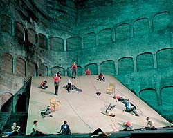 Условному сюжету, где действуют более или менее одномерные персонажи, сопутствует и вполне условная постановка. На сцене - громадный деревянный брус (справа), странного вида склад досок (в центре) и огромная наклонная плоскость с двумя намертво прикрепленными к ней креслами (слева). Вспоминается трехлетней давности зальцбургский спектакль "Cosi fan tutte" ("Так поступают все женщины"), действие которого происходило на сцене большего размера при еще меньшем, практически нулевом количестве декораций, а дирижер был не в пример слабее Айвора Болтона. Тем не менее драма четырех героев была настолько убедительно сыграна молодыми артистами и при том ни на секунду не теряла связи с драмой музыкальной, что слабость режиссуры отходила на второй план. Музыка "Армиды" в достойном исполнении оркестра "Моцартеума" сама по себе также убеждает, но действие не идет с ней рука об руку, оно оставляет чувство растерянности. И даже великолепный Михаэль Шаде, год назад блиставший в титульной партии в "Милосердии Тита", в роли Ринальдо мало похож на доблестного рыцаря и когда в отчаянии льет бензин на сцену и себе на голову, и когда освобождается от чар и покидает Армиду.