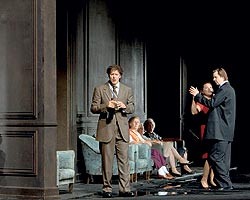 Все это могло бы быть вполне забавно, если бы не заслоняло историю героев: Андреа Брет, похоже, забыла о главном, сосредоточившись на мелочах. Например, шведский баритон Петер Маттеи великолепен и вокально, и актерски, однако навязанный рисунок роли ему явно мешает. Трудно слушать без слез исповедь Онегина, которую тот пропевает уборщику со шваброй так, словно хочет спросить: ты меня уважаешь? Татьяна - россиянка Анна Самуил - убедительна лишь в последней сцене, где ни ей, ни ее партнеру режиссура не мешает следовать за героями. И если отрешиться от несуразностей постановки, главными героями ее остаются Баренбойм, Чайковский и условный Пушкин, глядящий вдаль.