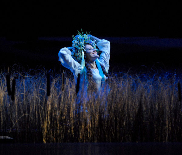 Но вернемся к приятным впечатлениям. Александр Титель вновь подтвердил свой талант постановщика легких и непретенциозных спектаклей, которые приятны глазу и повышают настроение. «Майская ночь» выглядит как сиквел одной из его прошлых работ – развеселого «Обручения в монастыре», на котором публика то и дело сотрясала стены театра громовым хохотом, а забавные мизансцены сообщали действию динамичный темп. Правда, второй опыт Тителя на комическом поприще обнаружил и изъяны авторского стиля: со вкусом прорисованные жанровые эпизоды (трио Головы, Писаря и Винокура в блестящем исполнении Леонида Зимненко, Дмитрия Степановича и Сергея Балашова) явно интереснее и содержательнее, чем линия, связанная с центральными персонажами – Левко и Ганной. Остроумно и смачно воссозданный национальный колорит (даже объявления о запрете на фото- и видеосъемку звучат по-украински) должен бы служить фоном для главной, лирической составляющей сюжета, а получается наоборот. Этот перекос подчеркнут и работой художника-постановщика Владимира Арефьева, создавшего блестящую сценографию с любовно прописанными деталями деревенского быта: форма в новом спектакле выглядит куда красочнее содержания.