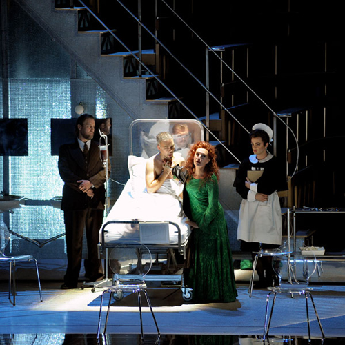 Постановка вагнеровского Opus mysticum, исполненная польским режиссером Кшиштофом Варликовским, — краеугольный камень сезона, спланированного интендантом театра Жераром Мортье. В любом немецком театре она сошла бы за «вегетарианскую». Постановка скорее обнажает проблемы произведения, чем дает ответы и приращивает смыслы. Не задаваясь целью шокировать пуритан, как в мюнхенском «Онегине», Варликовский вплотную и серьезно задается вопросом взаимосвязи поколений внутри отдельно взятой семьи. Ему не слишком ясно, что значит в сегодняшнем мире тема Грааля, зачем и на каких принципах сегодняшние люди могли бы объединиться в закрытую касту, отказаться от женщин и служить абстрактной идее добра. Рыцари Грааля напоминают здесь студентов-медиков, собравшихся то ли в университетской аудитории, то ли в анатомическом театре и наблюдающих за перипетиями в семье своих профессоров (декорация Малгожаты Чесняк — вращающийся амфитеатр, который мгновенно превращается из холодного зала, уставленного столами и стульями, в сакральное пространство). Рыцари — суровые зрители разлада между королем-грешником Амфортасом, страдающим от неизлечимой раны и мечтающим умереть, и его отцом Титурелем, отчаянно цепляющимся за жизнь. Неразрешимый моральный конфликт в этой семье сводит веру и ритуал к набору бессмысленных бытовых поступков.