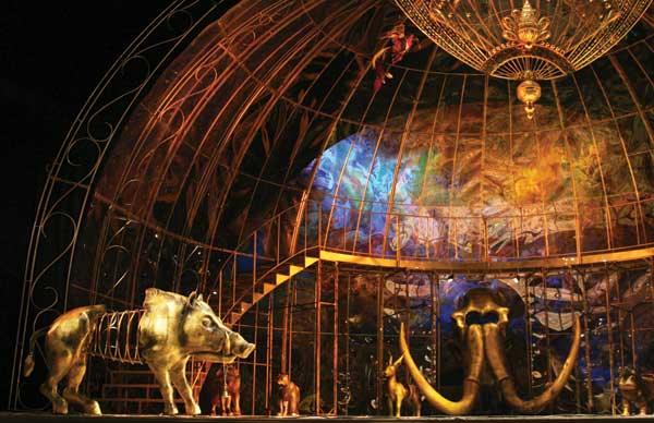 На сцене огромная золоченая клетка, которая в первом акте работает как клетка-птичник, а во втором — как клеть-зверинец. Но что-то в этой полусфере есть и от земного шара, деленного на меридианы и параллели, в любом случае, это человеческий мир, муравейник — смесь разных типов, индивидуальностей, характеров, каждый со своей мини-историей, собственным сюжетом, даже судьбой, как ни громко сказано. Вся эта человеческая мозаика составляет пеструю картину, но чрезвычайно живую и подвижную, которая говорит, двигается, поет, танцует дружно и с удовольствием. И не то чтобы существовал в сей плазме какой-то единственный герой, или главенствовала чья-то история, напротив, все закручены в клубок и перекатываются внутри клети как перекати-поле. Если что тут и главенствует, так сам жанр, он подан и сыгран с чувством. Это чтобы хор — так хор, каскад — так каскад, виртуозная ария — так чтобы и спета была как виртуозная (кстати, Светлана Лугова — Герцогиня, на долю которой выпало такое испытание, с вокальной задачей справилась, хотя актерски не избежала штампов — следов Марицы, Ганны, Сильвы в одном флаконе).