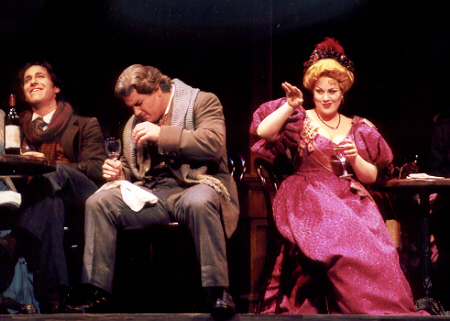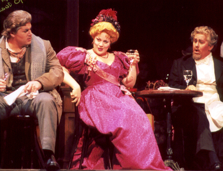 Из солистов бесспорно лидируют дамы. Округлое, глубокое, полнозвучное сопрано Элизабет Кабальеро (Мими) очаровывает с первых звуков, делая ее обладательницу центром спектакля не по сюжету, а по праву. Звонкое, искрящееся сопрано Джил Гарднер (Мюзетта) изрядно передает капризный характер героини. Техническое мастерство обеих солисток заслуживает всяческих похвал, ибо дает им возможность свободно создавать образы. У мужчин дела похуже. Пожалуй, лишь только Том Корбейл (Коллен) не испытывает никаких затруднений, его вокал ярок, а ламенто о старом пальто спето весьма проникновенно. Джеймс Валенти (Рудольф) недостатки вокала пытается компенсировать "итальянскими" рыданиями, чересчур эмоциональной игрой и эффектной внешностью. Это помогает, но не всегда - верхи недостаточно оперты, а оттого обезжирены и некрасивы, певец выстреливает их как петарды: получается громко, но и только. Оба баритона (Трой Кук - Марсель и Корей Крайдер - Шонар) удовлетворительны, но обыкновенны, не ярки - все ровно, точно, но не слишком запоминается. На удивление артистичен хор - видно, что для каждого хориста режиссер постаралась придумать свой эпизод, свою маленькую роль, превратив таким образом "поющих статистов" в полноправных актеров.