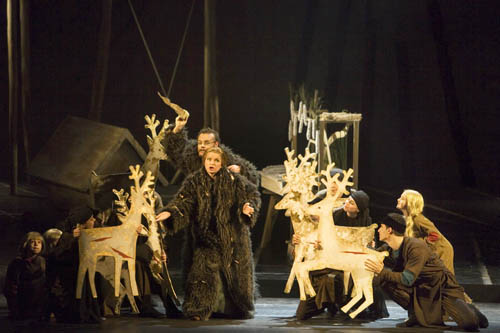 Постановка Эймунтаса Някрошюса очень хороша в первых трех актах. Надежда Гультяева придумала великолепные костюмы. Сцену, залитую золотистым светом, время от времени прорезают голубые лучи, создающие магический эффект. Декорации Мариуса Някрошюса отличаются символичностью: огромные ульи, подвешенные к балкам стилизованные занавеси, силуэты животных из тонкого дерева. Это образы, которые в сказочной манере передают атмосферу леса или крестьянского дома. Нехорошо получилось только с последним актом: музыка недотягивает, и Някрошюс пытается поддержать ее, создавая некий погребальный рай в черно-золотых тонах.