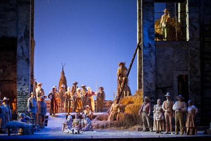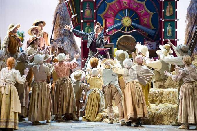 Фабио Спарволи больше известен как режиссер-ассистент, работавший, в частности, с великим Джорджо Стрелером. Поэтому вряд ли стоит удивляться, например, разительному сходству визуального ряда «Напитка» со стрелеровским «Фальстафом», перенесенным несколько лет назад на сцену Большого театра. Легко предположить, что сценограф Мауро Карози получил от режиссера задание сделать что-то в духе работавшего со Стрелером Эцио Фриджерио и вполне с этим справился. Нам показывают на сцене как бы настоящую (на самом деле, конечно, оперную) итальянскую деревню, с настоящими стогами сена и т.д. Сам режиссер практически полностью в этой декорации растворился, не обнаружив своего присутствия и в работе с исполнителями, действующими на подмостках и передвигающимися по ним вполне шаблонно. Впрочем, это отнюдь не самый плохой вариант, поскольку отсутствие явных противоречий и диссонансов с духом и стилем первоисточника по нынешним временам уже само по себе может рассматриваться как достоинство. Если бы сюда еще хоть чуточку больше юмора, без которого комическая опера как рыба без воды...