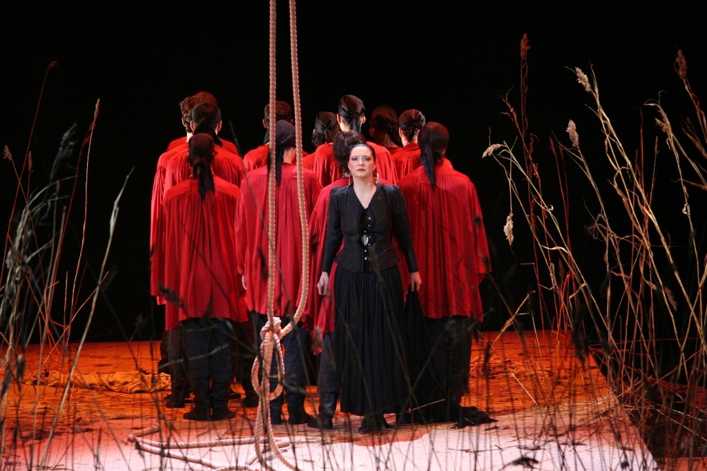 Действие решено как действо с фиксацией статичных, красивых композиций. Вот героиня на веревке, как на качелях, вот высоко поднята на руках цыган... Сцены же динамичные усилены таким движением среди застывшей осоки, что ее шуршание воспринимается как музыка. Впрочем, что бы ни придумал режиссер, именно подача музыки Щедрина то медитативно возвышенной, то пронзительно напряженной, очень индивидуальной по характерности только ей присущих интонаций, становится целью и главным смыслом спектакля. Авторское определение жанра — «опера для концертной сцены» — поставлено во главу угла.