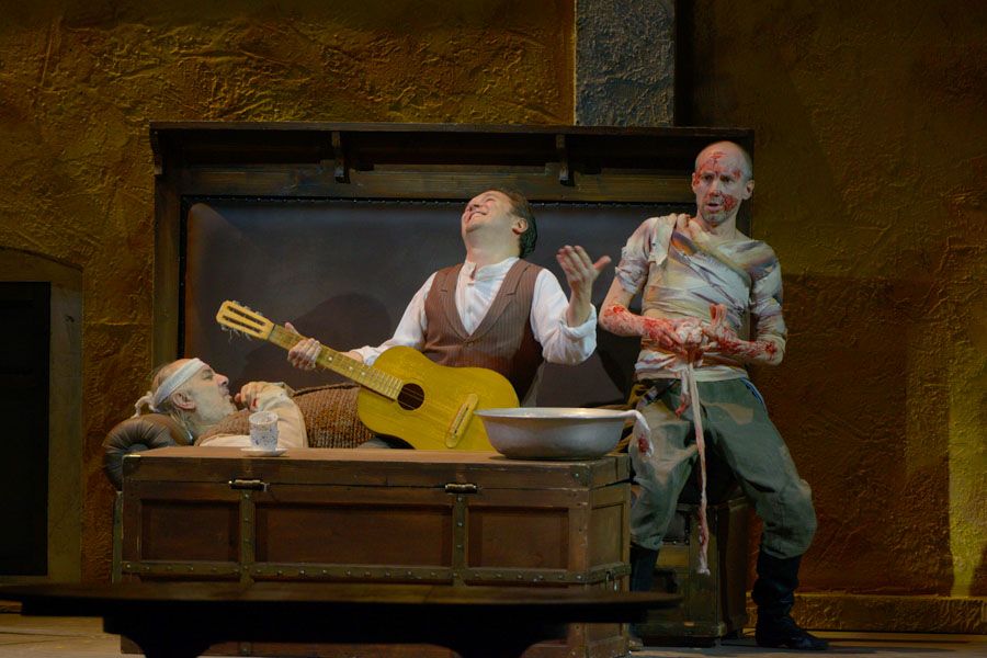 Вообще, ассоциации — литературные, музыкальные, театральные — множат смыслы этого спектакля. Они и в музыке Александра Смелкова — от тяжелой оркестровой поступи Бетховена до гротесков Шостаковича, вперемежку с интонациями романса и даже эстрадной песни прошлых лет. И дело не в перечислении источников (при знакомстве с партитурой перечень увеличится), а в том, как они собраны в целое. Ценность работы композитора, пишущего для сцены, часто в том, как работает «шум культуры» на решение задач истинно театральной музыки с ее лейттемами, характеристиками героев, способами развития драматической ситуации средствами оркестра, умением лирическое излияние героя передать через монолог или, наоборот, вдруг прибегнуть к форме ансамбля («Сон Алеши» — октет). И еще важно, как это воспринимается на слух. Доступность — это не всегда игра в поддавки, угодничество и заигрывания, а вежливость королей. Работает это правило сегодня по-новому, не на уровне прошлого века с его канонами песенной оперы, принятыми по велению партии.