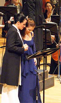 На главные партии – несчастных шекспировских любовников – были приглашены знаменитые итальянки: Патриция Чьофи (Джульетта) и Анна Бонитатибус (Ромео). Первая была в общем-то на своем месте – скорбный, страдающий взгляд артистки был подкреплен в целом очень качественным, стилистически выдержанным вокалом: хорошей нюансировкой, мастерским легато. Но несколько неудачных верхних нот в кульминационных моментах и легкое тремолирование голоса на середине значительно подпортили впечатление. Что касается Бонитатибус, то партия Ромео легла на ее голос значительно менее удачно, чем глюковский Орфей и россиниевская Золушка, слышанные в Москве ранее: можно даже сказать, что певица сильно уступала самой же себе. Все верхи вышли слишком напряженными и некрасивыми, зачастую в голосе слышалось неприятное дребезжание, кроме того, в нотном материале певица чувствовала себя не слишком уверенно, не раз расходясь с оркестром и постоянно подглядывая в ноты (в то время, как другие вокалисты пели наизусть).