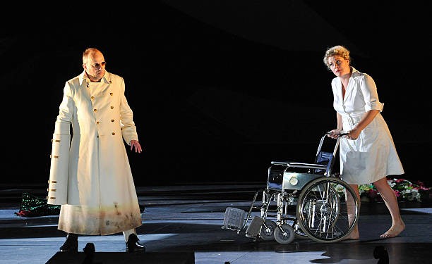 Игру ведут двое — паралитик-герцог в коляске и аппетитная медсестра в коротком халате. Открывая двери замка, она ходит по красивым платьям, а то швыряет их или прижимает к себе. Все остальное — от музыки. Меня потрясло оркестровое вступление (4 пьесы): брутальное, грубое, глухое, как непроходимый лес, мрачное и вампирическое. Петер Этвеш знает, о чем он говорит, предваряя темную сторону истории, которую будет рассказывать через полчаса. Песня про оленей — прозрачная, звонкая, чуть наивная, но в финале обнажившая второе дно. Ты заколдован: яркая стена в секунду улетает — и ты во владениях жуткого герцога. Этвеш так сыграл, так заворожил всех, что, казалось, окажись ты на месте Юдит, едва ли отказалась бы от возможности пройти через все ворота замка к самой последней и страшной комнате. Юдит полюбила мрак, полюбила зло. Это ощущалось залом на физиологическом уровне.