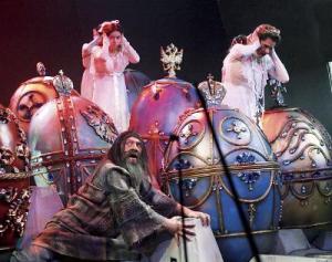 Как почти всегда в «Геликоне» ставил диковинную оперу главреж Бертман. Наклонный подиум являл собой гигантскую картонную кладку для яиц Фаберже, между которыми в первом акте сновали все – от хлыстов, до Романовых. Во втором, когда гигантские яйца были убраны, на их месте появились люки, из которых показывались излюбленные «геликоновские» руки. Финальная сцена оперы, уже после убийства самозваного пророка, демонстрирует нам торжество новой власти: из огромного яйца выскакивает Ленин в кумачовых одеждах и вещает через микрофон о гнилости монархического режима в России, в то время как «пролетарии» заполняют сцену и повторяют постоянно какие-то механистические движения – административно-командная система начинает свое победное шествие по стране.