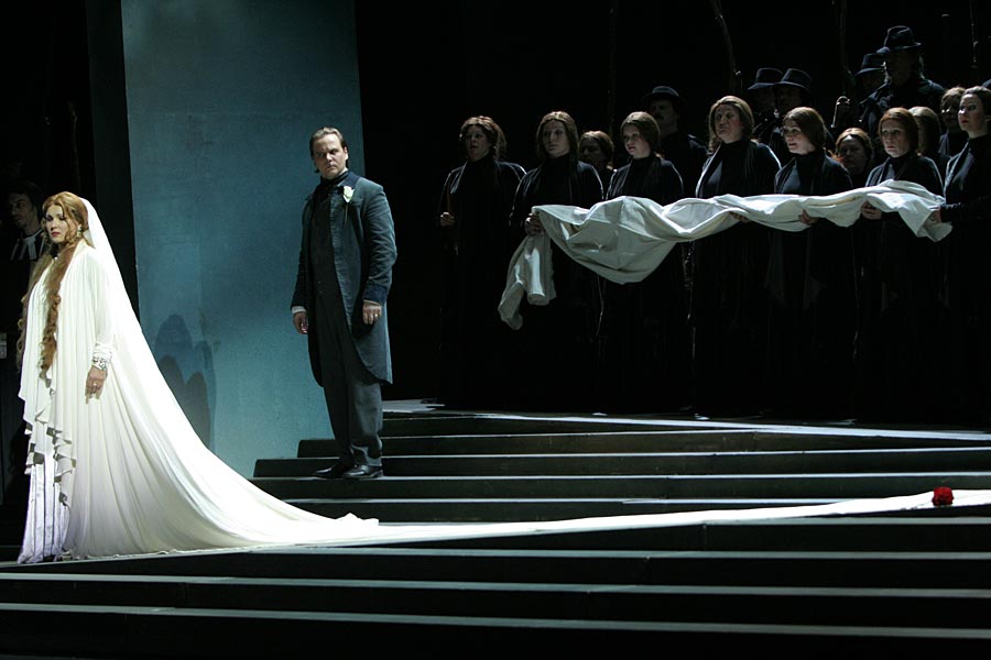 На сцене пара стен, выполняющих роль колонн, и некоторое количество плоских, широких лестниц. Все тонет во мраке, чуть разбавленном серыми облаками, мрак не рассеивающими, а усугубляющими. На лестницах — площадках так и эдак располагается хор, выступающий единой массой, вне зависимости от того, кого он изображает, — стражу ли, гостей ли на свадьбе. Мужчины с суковатыми палками, женщины со свечами ходят справа налево и наоборот, иногда застревая по центру. Ясно, что они тоже для пущего мрака. Еще более для мрака и страха — начальник стражи Норман. Ему режиссер уготовил особую миссию — соглядатая всех событий и особенно интимных встреч. Он превратился в главного героя: находился на сцене непрерывно, прятался за очередной колонной, на него то и дело натыкались, но делали вид — и он сам, и тот (или та), кто наткнулся, — что он человек-невидимка. Вид у него был, как у современного секьюрити, крайне невозмутимый и важный, а потому он предстал, в силу отсутствия реакций и подчеркнутой безучастности, фигурой крайне многозначительной. Нехитрую мысль о том, что Лючия — жертва интриги и предательства, в опере выражают словами, собственно, это и составляет сюжет, так что можно было бы огород не городить с этим начальником, да еще так плоско, назойливо и наглядно...