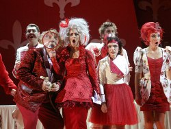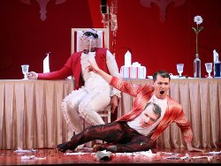Все действие Шапошников располагает на небольшой платформе, медленно выкатывающейся на самую авансцену, тем самым, суживая пространство и делая суету родственников Донати особенно концентрированно-гротескной. Все пространство затянуто, а герои одеты в ядовито красный цвет, свидетельствующий сразу о многом – и о богатстве, и о злобе, и о преступлении. Контрастами к нему выглядят белоснежные статуя Давида, праздничный стол и парочка влюбленных – Ринуччо (Нурлан Бекмухамбетов) и Лауретта (Галина Королёва), единственные, кому меньше всего дела до дядюшкиных денег, но которые в итоге оказываются в главном выигрыше. Скикки (Игорь Кузьмин) в данном решении – не просто хитрый, смекалистый плут, он еще и яростный обличитель пороков семейства, издевающийся над кучкой алчных родственников на полную катушку. Имея дочь-невесту сам Скикки еще очень молод, а оттого рискованно-изворотлив, отчаян и бесшабашен, не прочь поиграть с разъяренной толпой как дрессировщик в клетке с тиграми, который всегда уверен в успехе предприятия. Свои реплики за Донати Скикки произносит из под стола, а манипулировать телом покойного дядюшки он поручает родственникам – ситуация поистине трагикомическая, поскольку последние вынуждены под страхом сурового наказания за подлог не просто помалкивать, но еще и «иллюстрировать» телодвижениями покойного все, что говорит Скикки. А говорит он, как известно, совсем не в пользу алчной своры сокровников.