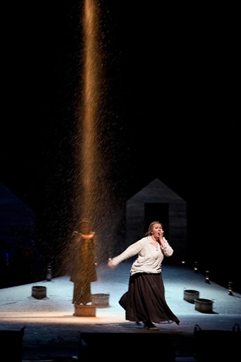 Простым и внешне незамысловатым выглядит режиссерское решение. Постановщик Пекка Милонов рассказывает реальную историю, но случившуюся столь давно, что сегодня она будто тает в дымке мистики, становится притчей, в которой люди сосуществуют с призраками в неразрывном единстве. Подобное соседство не удивляет — в старину, когда дети умирали от голода, и не такое могло быть. Крестьяне в опере действительно крестьяне — в серых рубахах и грубых сапогах, агитатор за социалистическую партию Пунтарпяя — лысый живчик в кожанке, персонаж, который российскими зрителями воспринимается вообще как архетип (его музыкальная тема — гротескно-развязный революционный марш — тоже до боли знакома). И между тем все происходящее на сцене художник Ээва Ийяс делает предельно условным. Деревянные домики и темные ели рядом с ними — двухмерны, ряд внесенных табуреток — и дом превратился в избирательный участок. На заднике вдруг могут появиться огромная луна или отдельные буквы из газетного текста, а потом внезапно пропасть. Кроме того, на сцене постоянно присутствует мимический ансамбль в белых свободных одеждах. Скорее даже балет, танцы для которого поставил хореограф Арии Нумминен. Призраки то танцуют вместе, то рассеиваются в толпе. Их функция — иллюстрировать слова героев (если речь идет о царе, один из «белых» обязательно изобразит царя, а все остальные — восторженный народ), но чаще — предупреждать о последствиях сделанного выбора. Их видят, но люди не хотят внять посылаемым им знакам. В конце концов белым ангелам ничего не остается, как только увести за собой умерших детей.