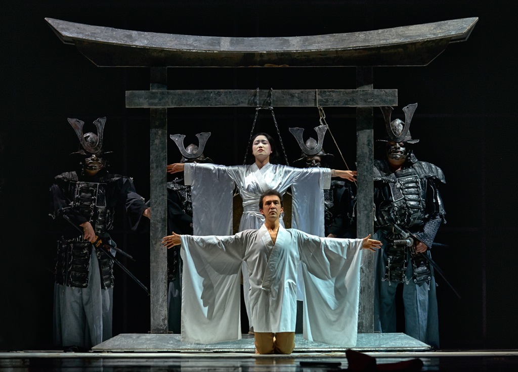 Между тем в постановке Михаила Панджавидзе многое зависело от актерской игры и ювелирно выстроенных камерных мизансцен, сменяющих одна другую, словно живые картины в драгоценной золотой раме. Новаторским его спектакль не назовешь: Панджавидзе на пару с опытным сценографом Игорем Гриневичем представил красивый, но вполне предсказуемый видеоряд, в котором доминирующий цвет — золотой. А предметная среда составлена из японского «джентльменского набора»: веера, бумажные фонарики, зонтики, кимоно, замысловатые головные шпильки, самурайские мечи и полупрозрачные ширмы. То есть все то, что представляет себе обывательское сознание при словах «Япония» или «Мадам Баттерфляй». Изысканная многослойная картинка, от которой за версту веет открыточным глянцем, слегка оттенялась экспрессивным видео: на ширмы, под звуки оркестрового вступления, проецировались разодранные в немом крике лица, бегущие люди и груды черепов, зияющих черными провалами глазниц. И это — побочный слой повествования, едва намеченный, но концептуально важный.