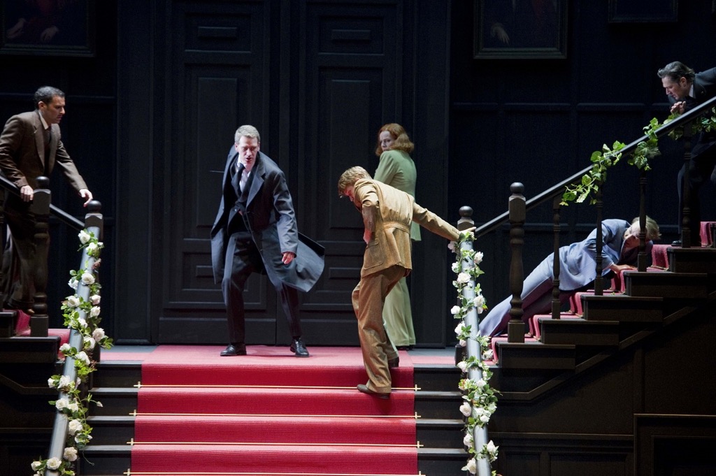 Примитивный и «забытовленный» сюжет оперы «Кастор и Поллукс» значительно уступает любой из сохранившихся мифологических историй про знаменитых близнецов. У Рамо вся история сведена к темам братской любви и самопожертвования, каковые, нечастые в реальной жизни качества в финале оказываются щедро вознаграждены богами. Почти ничего, кроме ходульных понятий: Елисейские Поля, царство Аида или могущество Юпитера, не связывает сюжет оперы с античностью. Этим воспользовалась постановщица венского спектакля Юлия Хансен и рассказала свою сагу, только не о Форсайтах, а о Диоскурах. У всех героев появляется группа двойников (драматические актеры), которые действуют во время звучания многочисленных в партитуре танцевальных сюит. Собственно, на этих персонажах, а не на певцах держится все действие, устроенное, как бразильский сериал. Вот два маленьких мальчика сидят на ступеньках огромной — во всю сцену — черной лестницы и играют вместе в машинки. Вдруг открываются дубовые двери вверху, оттуда выходит человек, похожий на телохранителя какого-то неизвестного нам босса, и подзывает одного из мальчиков. Тот хочет взять с собой брата, но телохранитель дает понять, что приглашение распространяется только на одного из них. Поллукс скрывается за таинственной дверью, второй же продолжает тихо играть в игрушки. Когда он возвращается с красивым самолетиком-истребителем, брат не завидует брату, потому что знает — добрый Поллукс поделится с ним дивной игрушкой. В доме живут девочки-кузины и другие дальние родственницы. Красотка Феба и неуклюжая угловатая Телаира, обе подруги влюблены в Кастора, смертного брата. Он же сначала отдает предпочтение старшей, потом, после возвращения из Оксфорда или Гарварда, забывает юношескую привязанность к Фебе и влюбляется в Телаиру, которую семья прочит в жены главному наследнику дома и состояния бессмертному сыну Юпитера Поллуксу. С этого момента, собственно, и начинается опера Рамо: как Поллукс, чуть ли не в день своей свадьбы, случайно узнает, что его невеста любит Кастора, и решает пожертвовать собой ради любимого брата, устроив его свадьбу с Телаирой. Все счастливы, кроме Фебы, которая братско-сестринской любовью не обременена и даже в качестве морального утешения, как в случае с Поллуксом, не получит ничего. Тогда она, одержимая завистью и ревностью, а также по злобе душевной подстраивает убийство Кастора, чтобы потом, пользуясь своими чарами волшебницы, вызволить его из Аида и женить на себе. За братом отправляется также Поллукс, готовый отдать за его жизнь свое бессмертие. Но боги принимают свое решение: если Кастор выйдет, то Поллукс должен будет занять его место в Аиде. Вопрос только в том, примет ли Кастор великодушное предложение брата. Сначала он категорически отказывается, а потом соглашается при условии, что сходит на один день, чтобы повидать жену, утраченную в день свадьбы, и вернется назад. Филантропия же Поллукса заходит далеко, и он надеется, что слезы жены заставят Кастора передумать и навсегда остаться в мире живых. В финале выясняется, что боги просто испытывали братьев. Как только Кастор собирается вернуться назад в Аид, несмотря на все стенания Телаиры, посланник богов Гермес выводит на свет божий живого и здорового Поллукса. Слава братьям-близнецам — теперь они оба бессмертны.