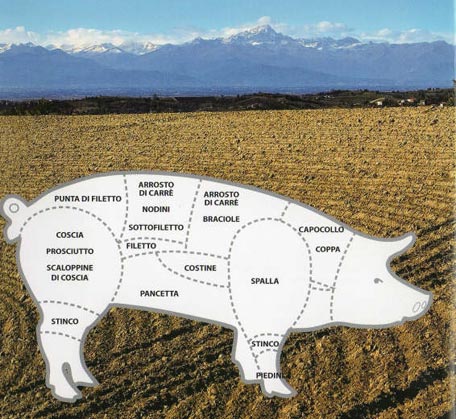 Жители Пармы утверждают: «Опера Верди — как поросенок, ничего нельзя выкинуть». Одно перечисление всех деликатесов, которые человеческий опыт и искусство извлекли из чудесного животного, заняло бы сотни страниц, не говоря об их описании. Так что рисунок с изображением частей тушки решительно поможет в этом нелегком предприятии.