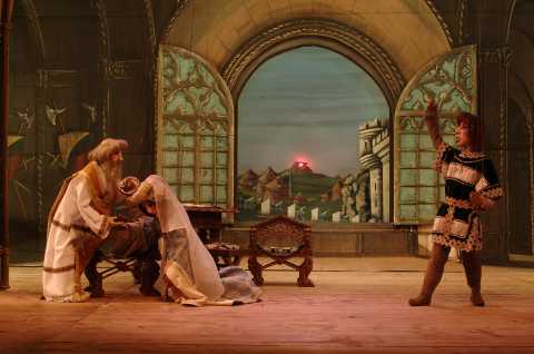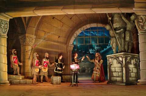 На этот раз – снова опера, и снова Верди. Если «Аида» в 2005 году была изящной экзотической сказкой со счастливым финалом, в которой главные герои чудесным образом спасались, то в «Трубадуре», где страсти буквально «рвутся в клочья», а души страдающих персонажей «изранены в кровь», страдают и умирают даже марионетки. Популярнейший шедевр Верди на либретто Каммарано по пьесе Гутьерреса – запутанный детектив в чистом виде, так что связно рассказать его содержание постараться надо даже взрослому! И поэтому, несмотря на пояснение, что привезенный спектакль – «сценическая версия для детей и взрослых», он всё же гораздо в большей степени предназначен взрослым. А если и детям, то умеющим бегло читать синхронный перевод текста и хотя бы в общих чертах знакомым со спецификой оперного жанра. Спектакль частично идет под знаменитую историческую фонограмму 1957 года под управлением Герберта фон Караяна, а частично – под тексты для пения, которые, не поются, а декламируются. Раскладка «фонограммных вокальных сил» была следующая: Леонора – Мария Каллас; Манрико – Джузеппе ди Стефано; Граф ди Луна – Роландо Панераи; Азучена – Федора Барбьери; хор и оркестр миланского театра «Ла Скала». Как и в случае с «Аидой», которую мы видели шесть лет назад, постановку «Трубадура» в магическом и изысканном пространстве театра марионеток осуществил Карло Колла III, а над режиссерским воплощением и дизайном кукольных костюмов потрудился Эудженио Монти Колла. Все куклы и костюмы к спектаклю, изготовлены в собственной мастерской театра, а перед московскими показами в конце сентября – начале октября итальянские кукольники успели показать этот спектакль в Красноярске и Новосибирске.