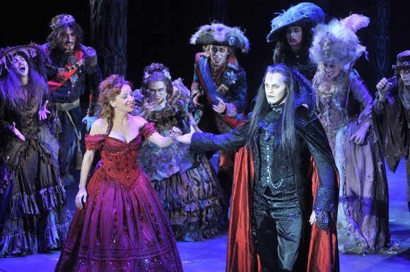 Это, прежде всего то, что театр научился работать со звуком, а это, пожалуй, — главное в современном музыкальном театре России. В недавней крупной и весьма успешной работе театра над мюзиклом «Чикаго» единственное, что огорчало – это то, что отлично звучащий оркестр под управлением маэстро Крылова местами нарушал баланс между звучностью хора и солистов, а сами солисты не владели в полной мере навыком пения в дистанционные микрофоны, и в зал из допотопных динамиков летели посторонние шумы, не имеющие отношения к музыке. В мюзикле «Бал вампиров» (дирижер Алексей Нефедов) ничего этого и в помине не было. Общая звучность восхищала идеальной сбалансированностью, и тексты вокалистов и хора были отчетливо слышны. Даже шумовые эффекты, призванные подчеркнуть мистико-агрессивную природу сочинения, не разрушали своей многодецибельной мощью общую звучность произведения. В основе своей роковая структура звучания, показалась мне несколько неосмысленной и малотеатральной. Много композиторского «рукоблудия», излишней и неосмысленной музыкальной суеты. Снова возник вопрос о сквозном музыкальном действии. Какую идею, какие человеческие деяния воспевает предложенное шоу? Какую цель преследует спектакль? Где та мелодическая основа, на базе которой строится музыкальная драматургия?