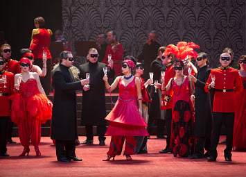 Постановка Андреаса Жагарса являет собой тот тип совершенно легкомысленного режиссерского равнодушия, от которого на душе всё же не муторно и не хочется метать «громы и молнии», но которое навевает смертельную тоску и пустоту. После того, как занавес упадет в последний раз, тяжелого осадка на сердце вы не ощутите, но уйдете с этой постановки абсолютно разочарованными. Почему? Да потому, что ее абстрактная, абсолютно надуманная сценография «прямых углов» и меняющих оттенок и фактуру драпировок, крикливо-опереточные костюмы, неожиданно отсылающие к временам мелкобуржуазного НЭПа и ходульные «лобовые» разводки солистов наполнены поистине изощренной антитеатральностью. За весь этот «клюквенный морс» ответственность с режиссером-постановщиком разделяют художник-сценограф Андрис Фрейбергс и художник по костюмам Кристине Пастернака. Немало пришлось поморщиться и автору этих строк, а кислое послевкусие от просмотра остается и поныне. И не надо обольщаться режиссерской ремаркой, сделанной в «programma di sala» на тот счет, что действие происходит в одном из европейских монархических государств в начале XX века, накануне Первой мировой войны, ибо сценографический облик спектакля – это типичная депрессивность гораздо более позднего времени (конца XX – начала XXI века), похоронившего художественно-эстетическую ценность визуального ряда как таковую, а вызывающе агрессивный гардероб этой постановки не только проникнут нэпманской неуместной харáктерностью, но и следами прямо какого-то «военного коммунизма» (уж слишком много на сцене кителей и мундиров!). А бордово-красно-черная гнетущая гамма оформления этой постановки «добивает» зрительское восприятие окончательно. Хотя афишное название обсуждаемого спектакля – «Бал-маскарад», постановщики, судя по заявленной локализации сюжета и исполняемому певцами тексту либретто, обратились к первоначальной редакции оперы Верди под названием «Густав III», связанной с именем шведского короля, убитого (смертельно раненного выстрелом в спину) Якобом Юханом Анкарстрёмом 16 марта 1792 года во время бала-маскарада в оперном театре (в либретто убийца монарха выведен под именем Ренато). Но как ни назови эту продукцию Михайловского театра, от какого-либо художественного откровения ей явно далеко.