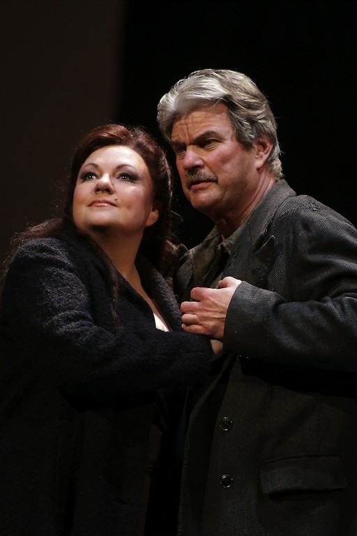 В первой картине первого акта сцена обита драпировками с золотым узором, а среди ее «населения» преобладают военные в мундирах (Густав и Ренато – в их числе). Люстры опущены вниз, а военный оркестр, за пультом которого стоит паж-адъютант Оскар, репетирует увертюру к балу-маскараду, который грянет в последнем акте. Во второй картине мрачная клетка-пещера колдуньи Ульрики буквально придавлена к планшету сцены за счет того, что всё пространство от «свода» этой пещеры до колосников сцены уже закрыто драпировками серебряно-серого оттенка. Теперь «население» сцены – люди в штатском (и действительно одетые по моде начала XX века). Ульрику превратили в эстрадную кафешантанную диву с сигарой в зубах, вырядив в платье, играющее блёстками. Бедную Амелию в первом же ее выходе заставили появиться в совершенно чудовищном наряде «нэмпанши»… О чем вообще думала художник по костюмам? О чем угодно, но только не об опере Верди – это совершенно очевидно. Центральный акт разворачивается в интерьере заброшенного здания, по всей видимости, бывшего многоэтажного цеха какого-то предприятия. Белый китель с эполетами и аксельбантами «хорошего» Густава противостоит аналогичному серому кителю «плохого» Ренато, а к прежнему бордово-темному наряду Амелии добавляется накидка и вуаль. Этот акт на огромной пустой сцене режиссерски решен настолько неинтересно, что если бы не гениальная музыка Верди и не Елена Панкратова, весьма культурно пробиравшаяся через дебри громогласного оркестра Михайловского театра и выдавшая просто изумительную каденцию в своей главной арии, то у меня были бы все шансы просто умереть со скуки, так и не дожив до кровавого финала драмы…