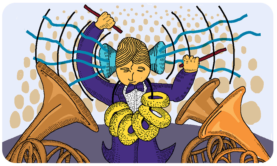Натуральная валторна — такой бублик, и внутри этого бублика — маленькие бублички. Это кроны. То есть вставляется крона, и из-за этого меняется общая длина инструмента. Чем больше длина, тем ниже звук. Исполнители на натуральных валторнах все приходят с такой связкой баранок. А современная валторна — она уже хроматическая. То есть можно поменять длину переключением вентильных клапанов и получить любой звук. Но традиция записывать партию в до мажоре осталась.