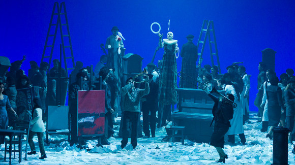 Когда открывается занавес, то картинка впечатляет и вдохновляет – туманное утро где-то на парижских крышах явно удалось Бернару: сине-сизый тон, доминирующий на сцене, скупость реквизита, мягкий, обволакивающий, совсем неяркий свет настраивают на романтическую историю и говорит о стильности в реализации задуманного. К сожалению этот первый эффект визуального порядка остаётся единственным ярким впечатлением для глаз: все прочие картины оперы решены совершенно также – на сцене темно, чуть светлее, чем в зрительном зале, дымно в силу постоянно нагнетаемого туда театрального дыма-пара, и сине-серо-сизо всю дорогу. Стильность куда-то уходит – остаётся невыносимое утомление от всех этих сумерек, в которых, словно в наркотическом дурмане, барахтаются герои оперы.