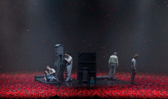Сцена обжита очень скупо – и мансарда в первом и четвертом действии, и Латинский квартал во втором, и застава в третьем зияют пустотой. Само по себе это и неплохо – загромождать сцену бессмысленным декором совершенно не нужно. Но в сочетании с унылым светом-цветом серо-сине-сизая пустыня навевает откровенную скуку. Люк в полу в мансарде, через который появляются на сцене все герои, и вагончик гастарбайтеров в третьем акте, в котором расположился, судя по всему некий притон (среди его обитателей – Рудольф и Марсель с Мюзеттой), — вот немногое разнообразие, которое позволяет на сцене Бернар.