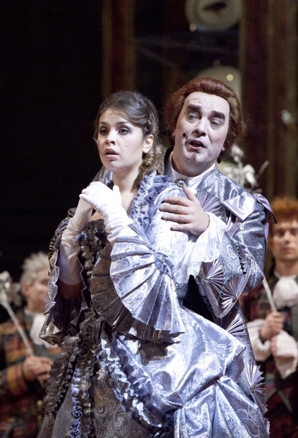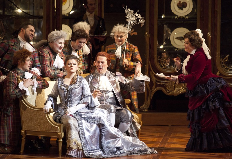 Нарядность более двухсот костюмов не аляповата и не криклива, несмотря на свою пародийность, а иллюстративный диалог цветовых решений местами просто завораживает: так, в первом акте синий мундир Октавиана перекликается с синим кринолином Маршальши, а во втором — серебряный камзол Октавиана — с серебряным платьем Софи. Серебром отливает и строгое платье Маршальши во второй части третьего акта — как увядшая серебряная роза, она исчезает вместе с отцом Софи не то в дверном, не то в оконном проёме (интерьерная незатейливость сценографии Бенуа Дугардина, в которой использованы не только известные фрагменты декора знаменитого Отто Вагнера, но и оформительские идеи Юргена Розе к постановке Отто Шенка в Баварской государственной опере, поражает воображение своей функциональной насыщенностью).