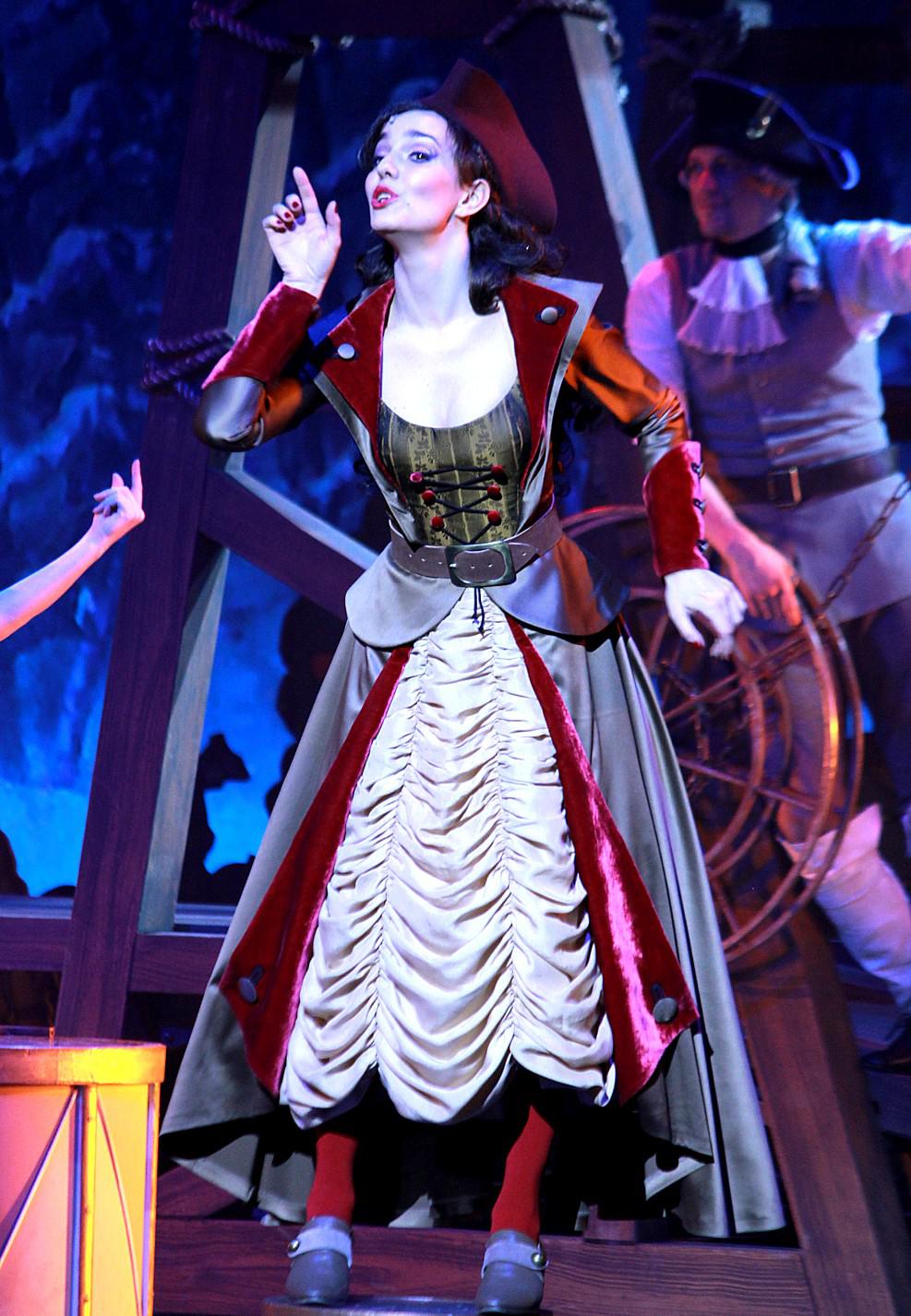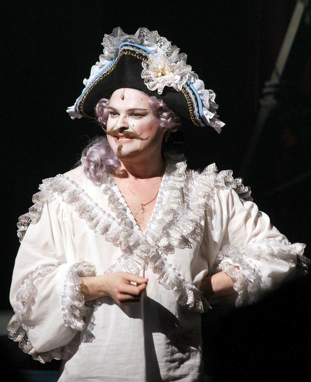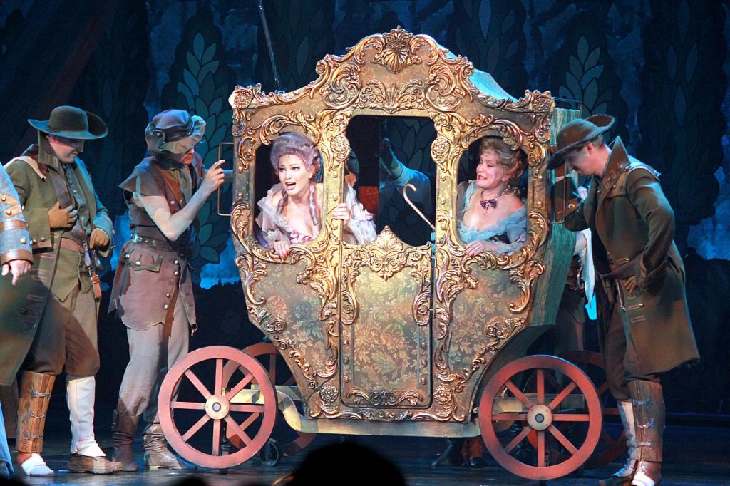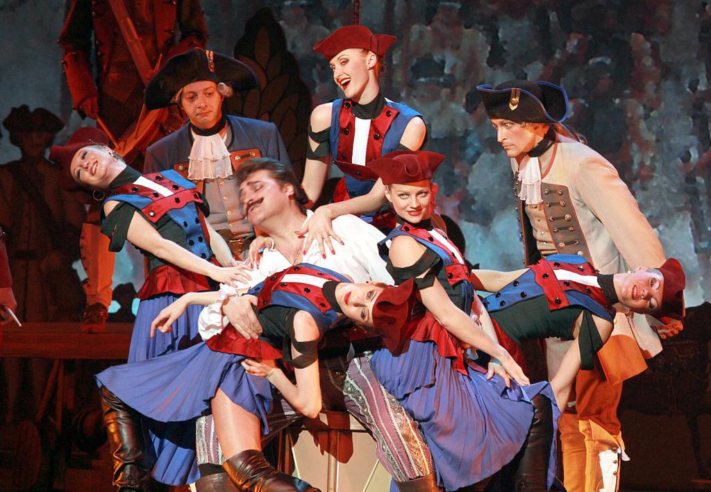 Кроме того, очень слабое звено постановки – костюмы (что категорически недопустимо для коммерческого шоу, у которого немалая часть аудитории – гламурные барышни, решившие выгулять в свет новое платье). Всякий раз, когда задумка выходила за пределы строгого, в духе первого фильма 50-х годов, следования историческому костюму, получалось плохо (а когда не выходила – получалось, опять же, скучновато). Цыганку Аделину нарядили в тяжелый балахон в холодных бирюзово-фиолетовых тонах, более приличествующий какой-нибудь дочке водяного на детском утреннике, нежели жизнелюбивой полковой маркитантке в гусарской комедии. Еще более неоновый сине-фиолетовый цвет обосновался на пионерских юбках-колокольчиках у канкана, изредка он сменялся не менее неоновыми пластмассовыми юбками-каркасами. А несчастную маркизу де Помпадур и вовсе обрекли провести значительную часть спектакля и спеть блестящую арию в нелепых панталонах, никаким парижским шиком не отличающихся.
